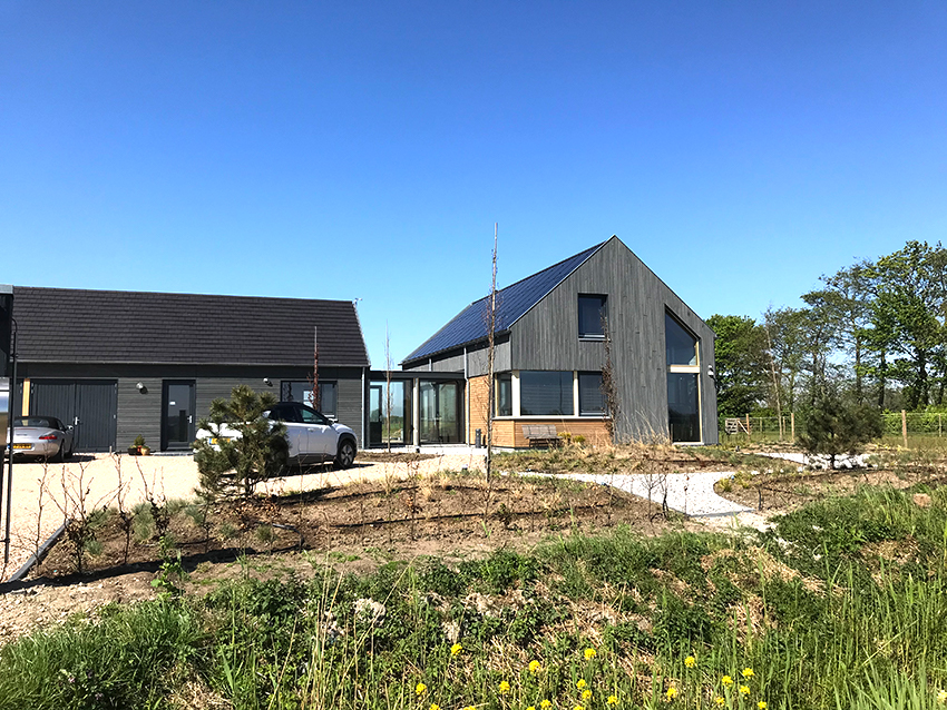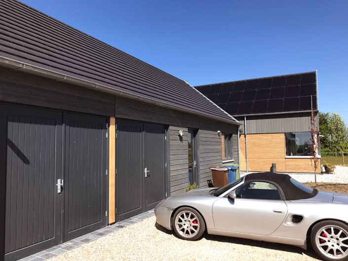 De woning en het bijgebouw worden verwarmd door een grondgebonden warmtepomp. Een WtW (warmte terugwin installatie) zorgt voor de verse lucht toevoer in de woning. De PV panelen zijn geïntegreerd in het dak voor een moderne uitstraling.