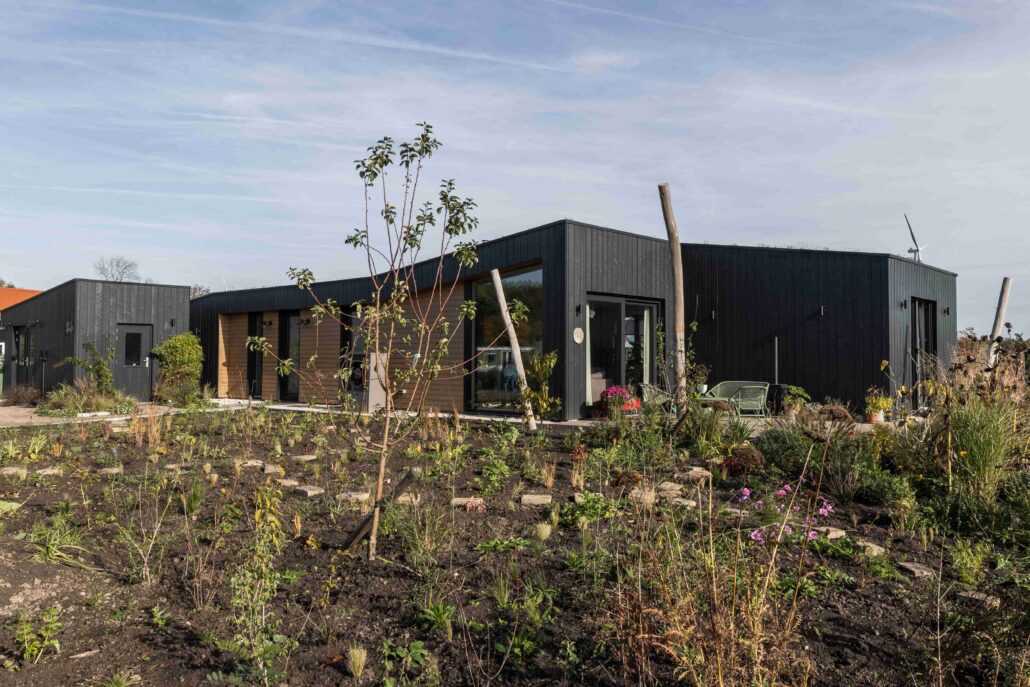 Deze bungalow kenmerkt zich door de glooiende vormen, passend bij de natuurlijke omgeving. Het dak is als een landschap en beweegt mee, en wordt bovendien met sedum bedekt. De gevel is variërend door het toepassen van verschillende kleuren en benadrukt bovendien het glooiende dak. Doordat het dak ontstaat er ook een speels effect binnen en wordt bovendien meer hoogte gecreerd en daarmee meer ruimtelijkheid.