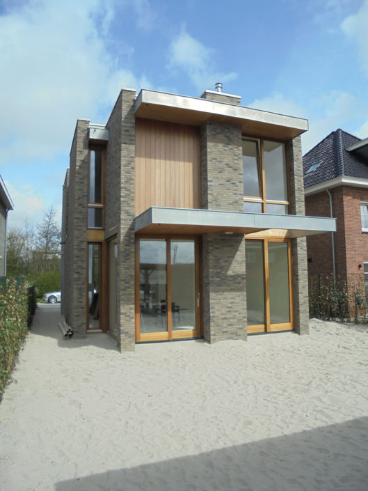 Het ontwerp is gemaakt door Engel Architecten, en is door Finnhouse verder vertaald. De zinken luifels, meranti kozijnen, de gemêleerde stenen en rechte vormen geven deze woning aanzien. De opzet is eenduidig en functioneel. Deze houtskeletbouw woning heeft in verband met beeldkwaliteitseisen een stenen jas gekregen. De woonlagen zijn extra hoog en de hoge kozijnen zorgen voor een ruime opzet. De buitenwanden steken halverwege naar buiten hetgeen de woning speels maakt, maar gelijktijdig extra lichtinval benut wordt. De gehele voor- en achtergevel bestaat voornamelijk uit kozijnen.