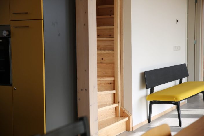 Deze woning is ontworpen met de omgeving als uitgangspunt. Het ontwerp is van de klant zelf: Reina van Mourik – Grunstra. De vloeiende ronde kap en de mosterd gele kleur verwijzen naar het glooiende landschap en het strand op het eiland Vlieland. Gericht op de verhuur is de woning efficiënt ingedeeld en door de ronde kap wordt extra hoogte gerealiseerd op de zolder.